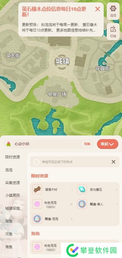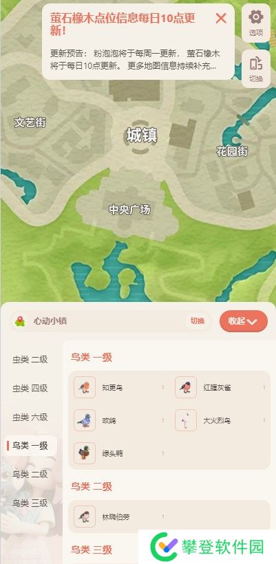 心动小镇地图使用教程:1、地图工具进入之后可以查看每日萤石橡木点位信息,每日十点就会更新,下面还有鸟类,小镇居民,城镇设施等点位地图可以使用。