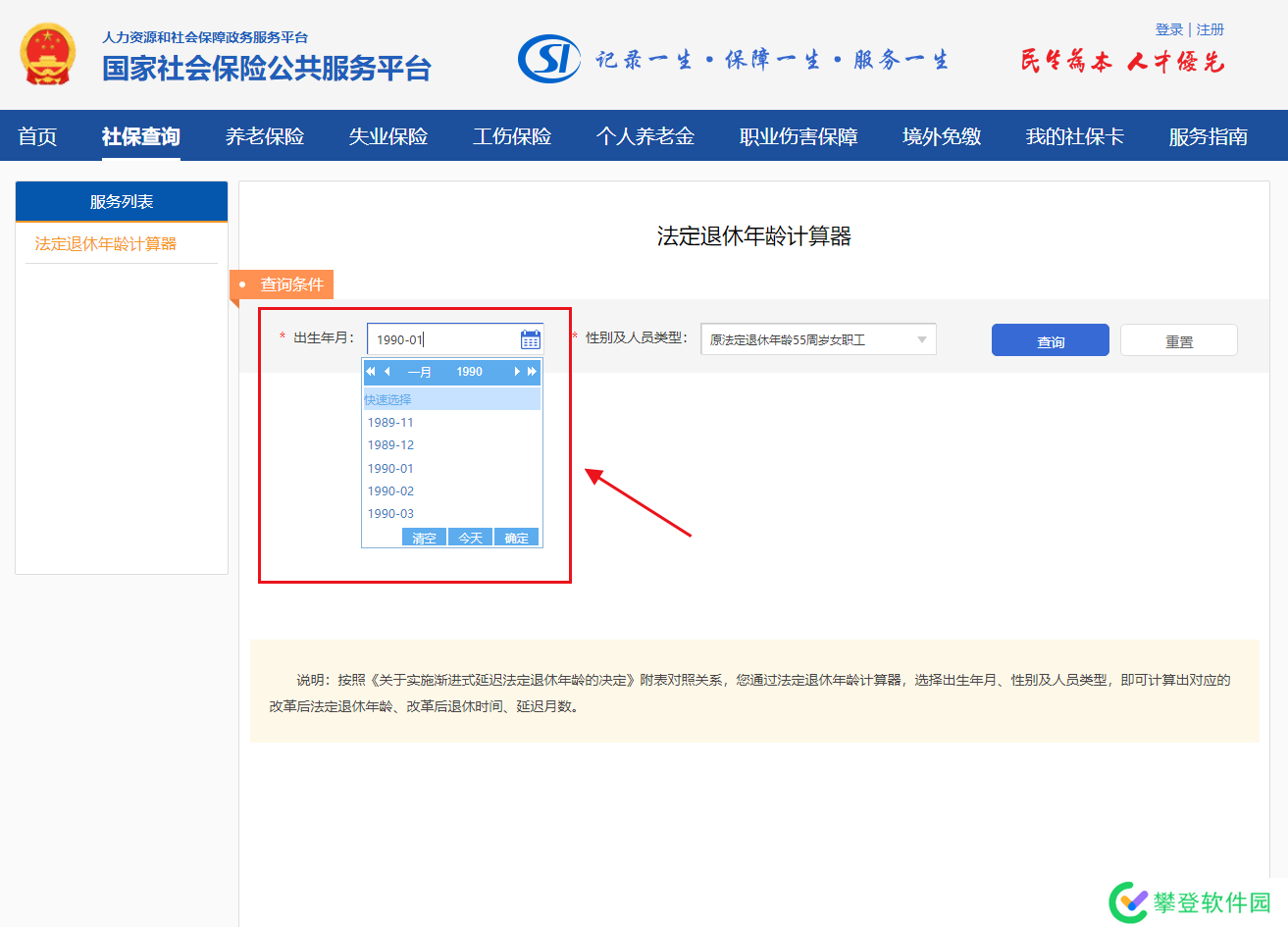 如图所示,您需要填写你的出生年月,这里以1990年1月出生的职工为例;