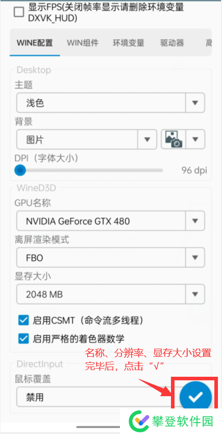 7、名称、屏幕分辨率、显存设置完毕后点击“√”;