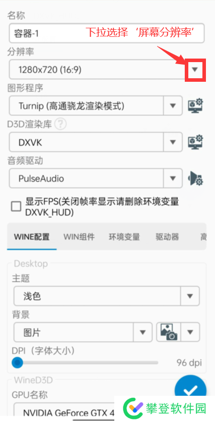 5、下拉选择“屏幕分辨率”(建议手机配置较低的玩家,可以将分辨率调小);