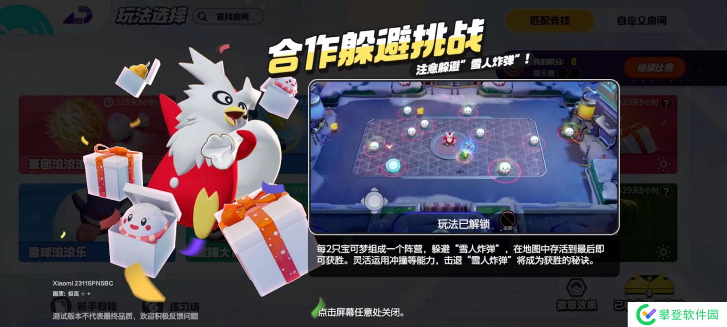 2.玩法介绍:地图中央的信使鸟,每隔一段时间会随机在地图投放雪人炸蛋和文柚果,拾取文柚果可以恢复大额血量。训练家们通过模式里自带的“击退”招式推开雪人炸蛋,如果雪人炸蛋长时间无人推开,将会在周围爆炸。当雪人炸蛋靠近时,训练家可以使用击退进行躲避,被雪人炸蛋炸到时会损失血量并短时间无法动弹,当被击杀时,场上若还存在队友则会进入倒计时复活。每推开一次雪人炸蛋,击退链接招式会累积一格能量槽,累积六格则会激活击退链接,使用此招式可以跟队友合体连接,位于链接上方时我们只能使用击退招式,击退周围的雪人炸蛋,而位于下方时我们仅能操控方向杆,因此考验的就是训练家跟队友之间的默契程度了。