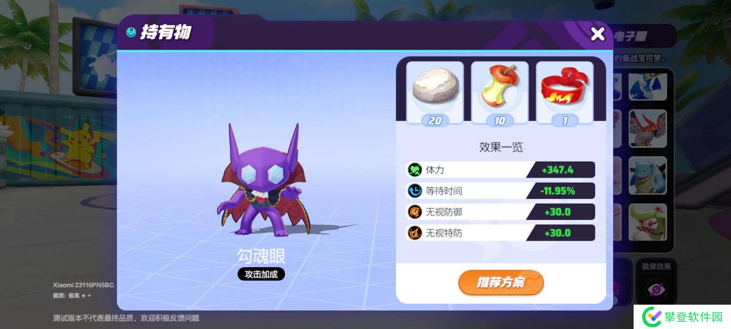 2.持有物推荐:“轻石”“吃剩的东西”“气势头带”合作躲避挑战是一个讲究准度跟躲避能力主题赛模式,因此携带轻石可以增加我们的移速提高躲避的概率,吃剩的东西可以脱战回血保持健康血量,气势头带给予我们残血回复能力让我们更加持久。