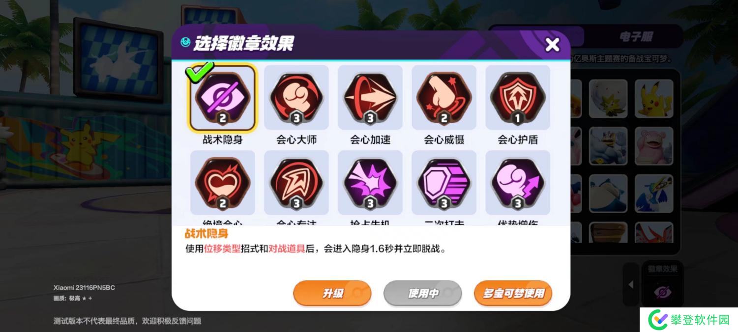 3.徽章效果推荐“战术隐身”使用位移招式和对战道具时,会进入隐身1.6秒并脱战,搭配上勾魂眼独特的被动以及一技能招式和击退招式(两秒cd)基本上能无限隐身,并且徽章的脱战效果可以跟吃剩东西联动脱战回血,移动泉水实至名归!