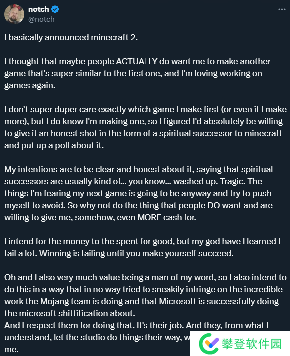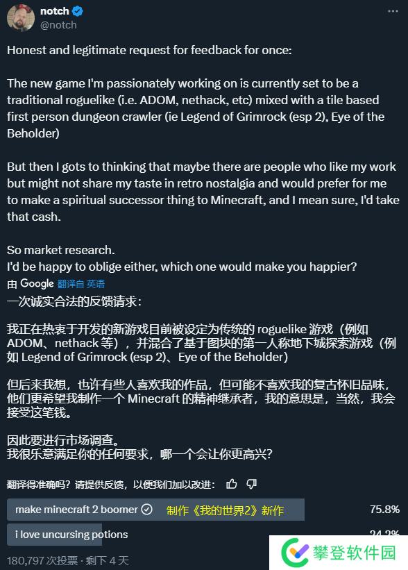 消息的源头来自“notch”于1月2日在X平台上发布的一条动态。他在该动态中表示,自己正着手开发一款全新的游戏。起初,他考虑的是制作一款传统的地下城探索类肉鸽游戏。但鉴于广大玩家对《我的世界2》的期待之声愈发高涨,他决定向玩家们征集意见,再做定夺。