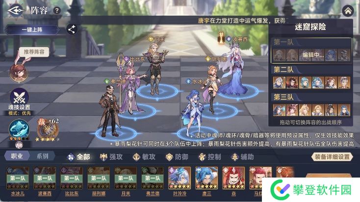 3、碰到有一个队伍打不过的情况,可以看看战报,把能打过的并且回合数少的那个队伍拆开,去支援打不过的队伍,最极限的情况就是三队都是19或者20回合打过。参考阵容如下: