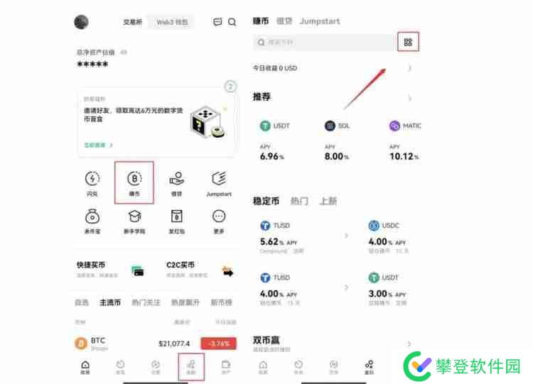 1、登录欧易APP(点击注册),点击首页【赚币】按钮,或者【金融】栏,并点击赚币页面右上角按钮