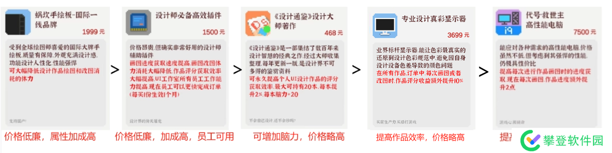 前期别碰,开工作室了再看,这个增益相对较小,中期用得上用来加快你改图交作品的效率,但是如果你还没开起来工作室不建议购买,太贵了,开起来工作室就没买的必要了,毕竟基本上都是员工工作了,等到后期就更不需要了,你评分基本上都是溢出的,画完都不用改可以直接交自然不需要这个的评分增益。