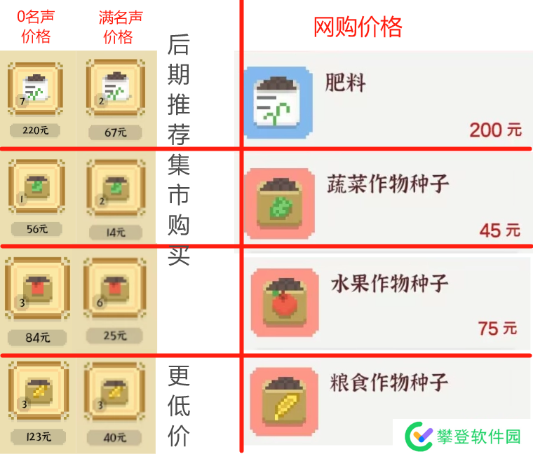 肥料:建议网购,前期集市的价格较高,后期集市能买到的肥料不够用。