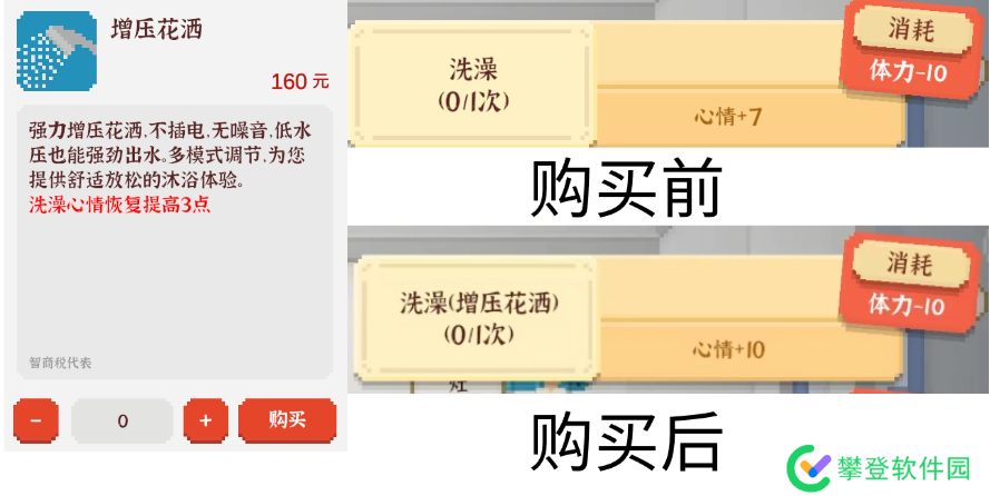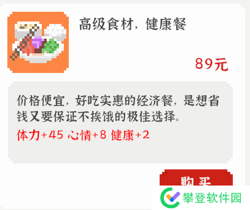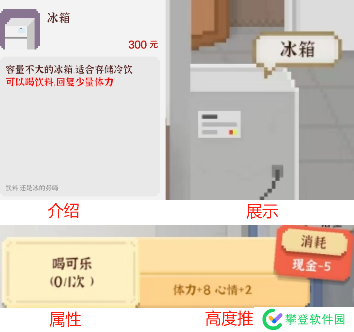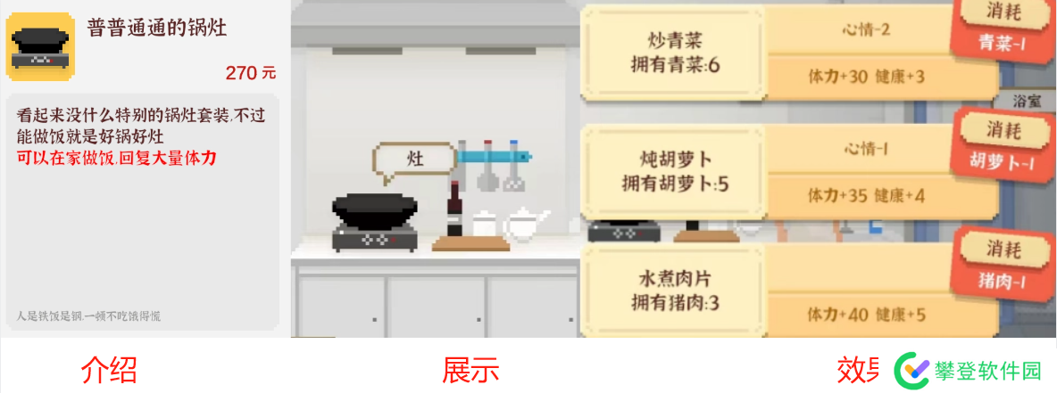 效果:在【家】可使用,花费5金钱每次增加8体力、2心情。