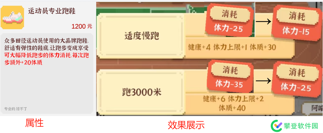 效果:在【运动场】可使用,每次降低10点跑步的体力消耗,每次跑步额外增加20体质。