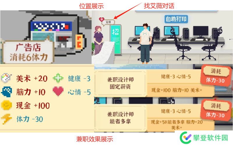 决定效果:脑力;消耗体力:30点;消耗健康3点,心情4点、兼职陪玩不消耗心情。