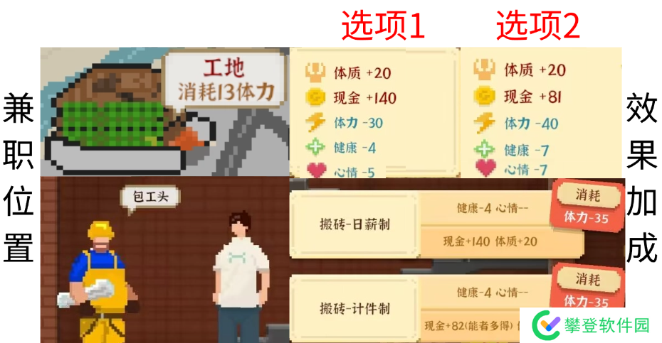 属性加成:固定薪资100元,兼职能者多拿多劳多得;脑力(选项1为10脑力,选项2为20脑力)
