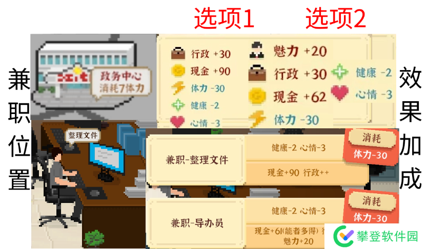 属性加成:兼职整理文件固定薪资90元,兼职导办员能者多得;脑力(选项1为10脑力,选项2为20脑力)