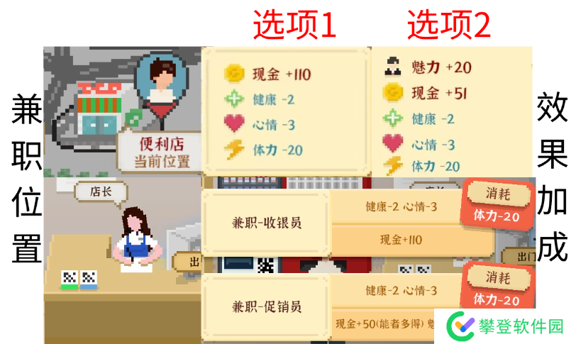 收益情况:选择兼职收银员,结果会增加110现金;选择兼职促销员,增加对应魅力所得现金并增加20魅力。