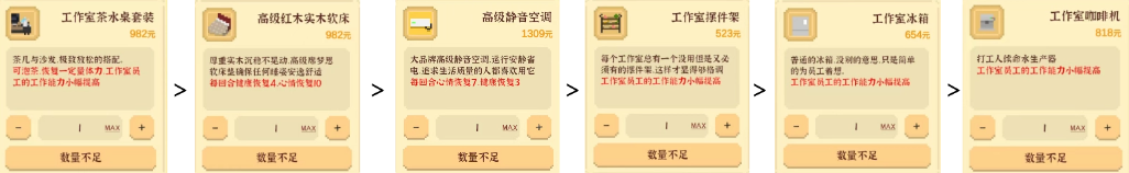 优先购买工作室茶水桌套装,增加体力恢复。