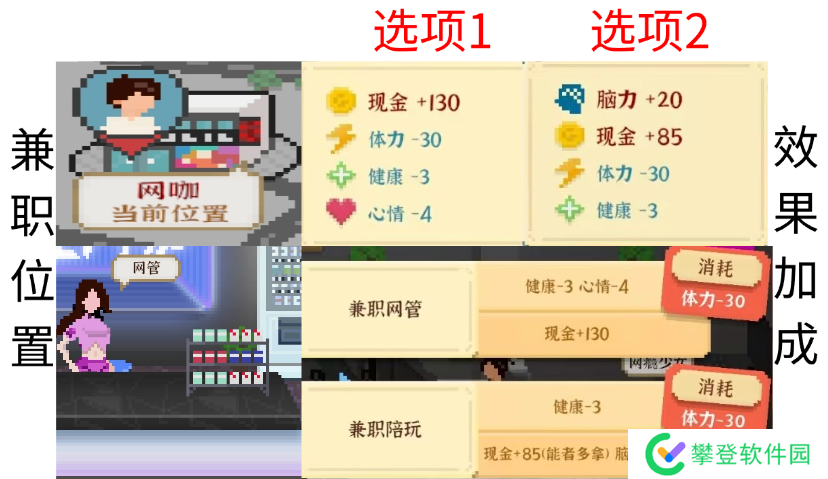 属性加成:兼职网管固定薪资130元,兼职陪玩多劳多得并增加脑力;兼职陪玩可以脑力+20