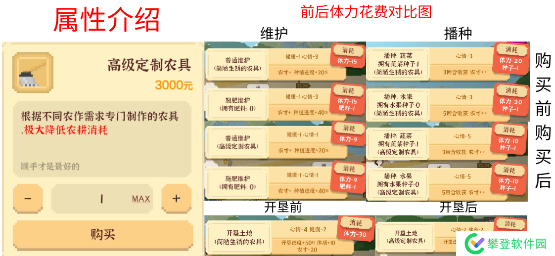 购买农具前后的图片我已经花了半小时一一找游戏截图做成了一个表格,可直接观看下图。