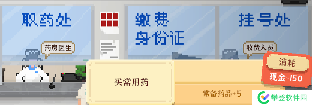 医院药房医生购买,150购买5药品,每天可使用一次,健康+3