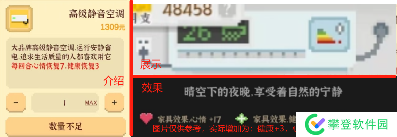介绍:每回合睡觉时自动回复4点健康和10点心情,可以降低你的健康心情的数值压力,建议买完工作室茶水桌和高级红木实木软床后购买。