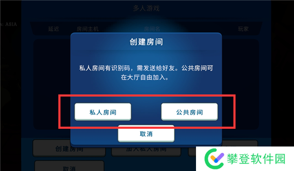 4、创建房间:选择是创建私人房间还是公共房间,满足您的联机需求。