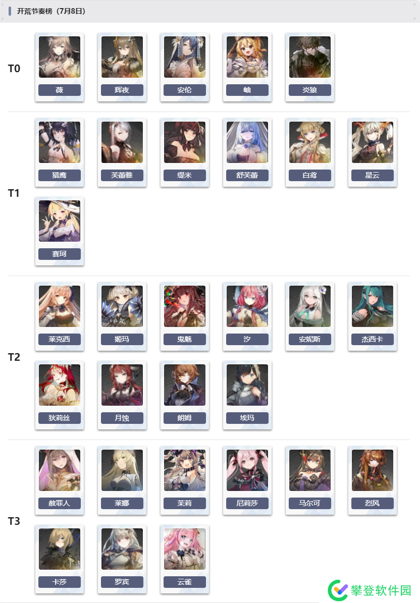 3. 梯度评价标准:开荒更看重PVE对精英以及对boss战的作战能力,其次为部分关卡需要的AOE能力。PVP考虑优先级相对较低。5星角色由于突破升级觉醒的白值较高,整体评价不会低于T1,但是可能在特定领域表现不佳,如缇米对单能力较弱。