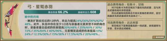 1.1. 五星弓·星鹫赤羽:除作为恰斯卡的最优武器外,也是部分情况下甘雨和达达利亚期望最高的、或最高一档中的武器,对这两名角色的武器选择有一定影响。