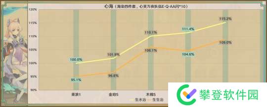 4.2.1. 作为战场输出定位、且选择多水元素角色队伍时,心海可以视情况选择乘浪的回旋,在精1时略低于精5试作金珀、精5时有一定提升,但由于保证特效覆盖需要改为EQ连放,可能影响实际表现与体验。(与木棉之环相同,乘浪的回旋图表计17/20段普攻覆盖,但都没有考虑手法改变对队友的影响,实测结果上图表中的几件四星武器队伍总伤都没有明显差别)