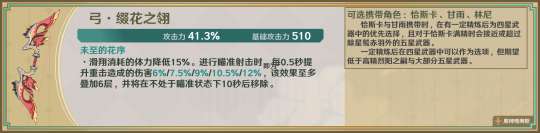 5.3.1. 缀花之翎在有一定精炼时可以作为选择,拟定情况下精1时与精5破魔之弓、碎链与精1烈阳之嗣表现基本接近,精3后会高于全程触发双倍特效的破魔之弓;精5缀花之翎基本是最优先的四星武器,期望与精1阿莫斯之弓接近、约为精1缀花之翎的90%。
