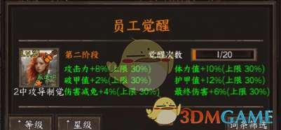 图一是没有员工觉醒词条的,图二是员工觉醒sss,每次觉醒加2%(固定数值,类型不同而已),每个阶段差20%。