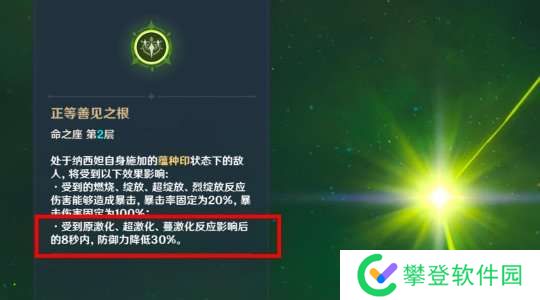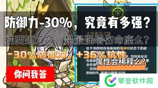 “减防御”手段是非常稀有的辅助能力,就目前版本而言,能减30%防御力的辅助只有纳西妲的二命。