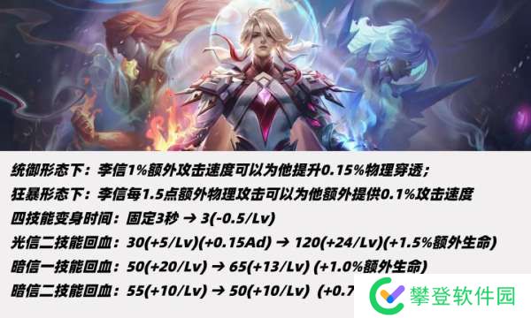 ①李信光明形态:每1%额外攻速提升0.15%物理穿透,二技能回血提升基础数值,AD加成改为额外生命值加成。