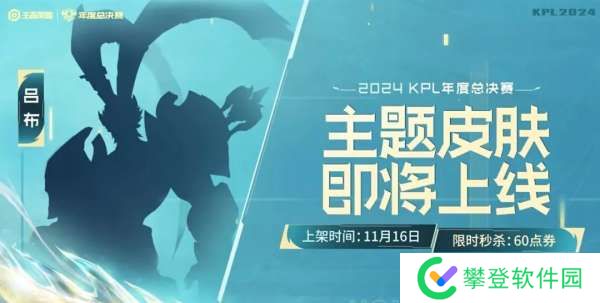 吕布KPL年度总决赛主题皮肤,将于11月16日零点上架,售价60点券,目前海报建模和技能特效暂未公布。