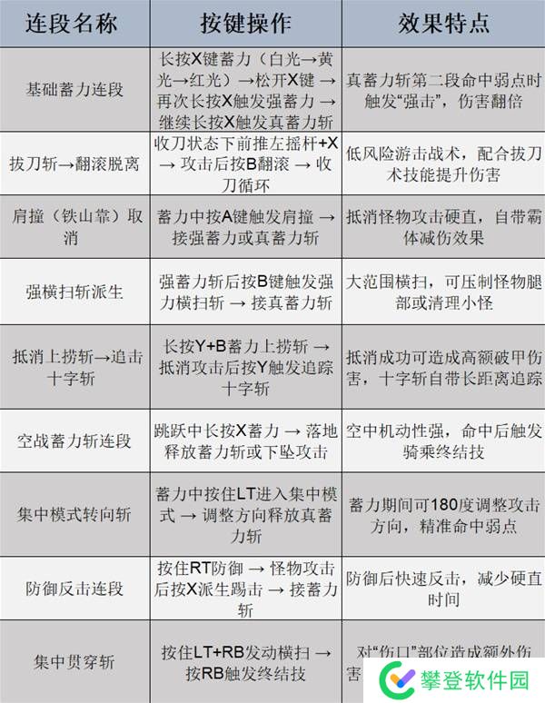 相杀斩:与怪物拼刀成功后触发,派生追击十字斩,兼具伤害与追击能力。