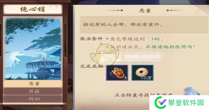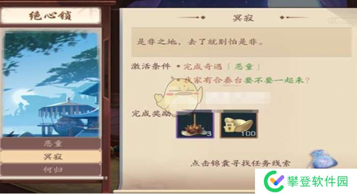 新笑傲江湖更新了一些新的奇遇任务,其中就有个绝心锁的任务,这个奇遇需要在五霸冈,但是分三个阶段,分别是恶童、冥寂、何归,具体的解锁方法很多人可能还不是清楚,所以没有解锁的小伙伴来参考《新笑傲江湖》禅林息慈奇遇触发方法,感兴趣的话就进来参考吧。