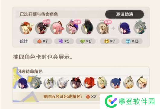 在已选角**域,会统计各分类下的角色数量,并在抽取角色卡时展示。