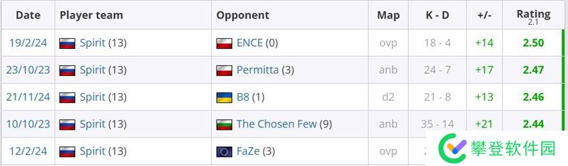 而在这场比赛中,Spirit队员donk打出了2.46 Rating、21-8 K-D、147.9 ADR的职业生涯第三高单图数据: