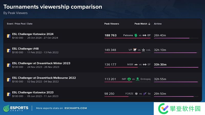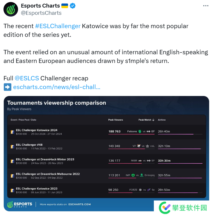 根据外媒Esports Charts的数据显示,最近的ESL 挑战者 卡托维兹站无疑是该系列赛事中最受欢迎的一届。