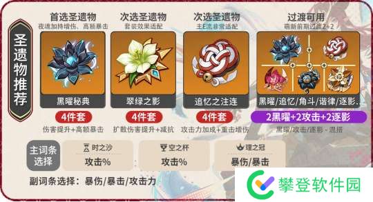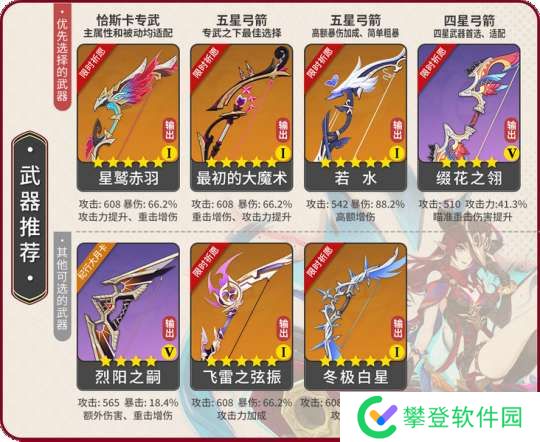 PS.武器依据期望伤害从高到低依次为:精一星鹫赤羽、精一最初的大魔术、精一若水、精五缀花之翎,其中精五缀花之翎为四星武器首选;