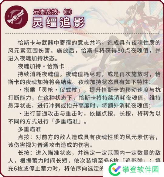(1)恰斯卡与武器中寄宿的意志共鸣,造成具有夜魂性质的风元素范围伤害。施放后,恰斯卡将获得80点夜魂值,并进入夜魂加持状态。