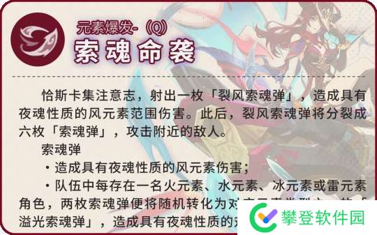 上述造成对应元素范围伤害的效果,每次施放索魂命袭至多触发1次该效果。