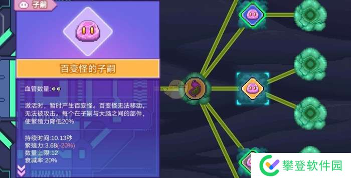 触发子嗣的器官建议选择消化系统,子嗣持续时间越长越好,繁殖力越高越好,数量上限可以靠增加子嗣部件来增加,不过越大越能节省大脑占用,综合来看百变怪最优。