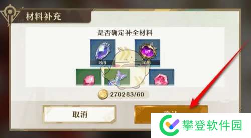 4、触发材料补充弹框,点击确认,获取材料后即可关闭当前页面再继续为梦灵升阶。