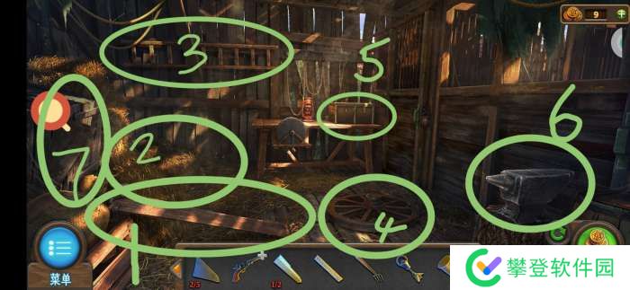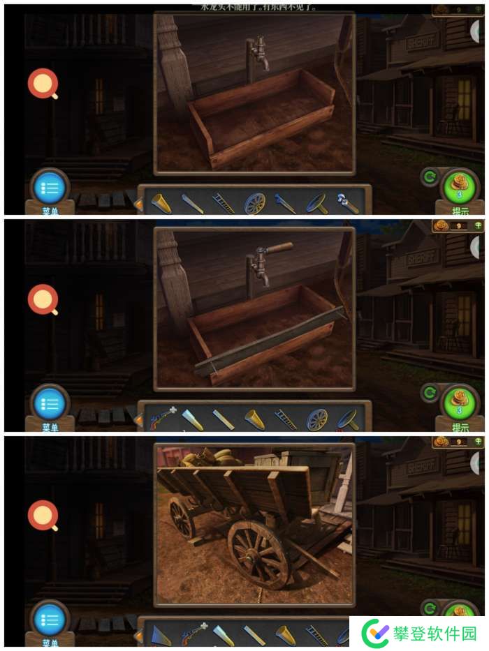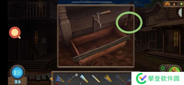 4、在椅子上、马车旁分别获得一枚风力发电机叶片1/5。马车旁获得叉子。水槽小场景获得钥匙。点击左侧门进入第三场景。