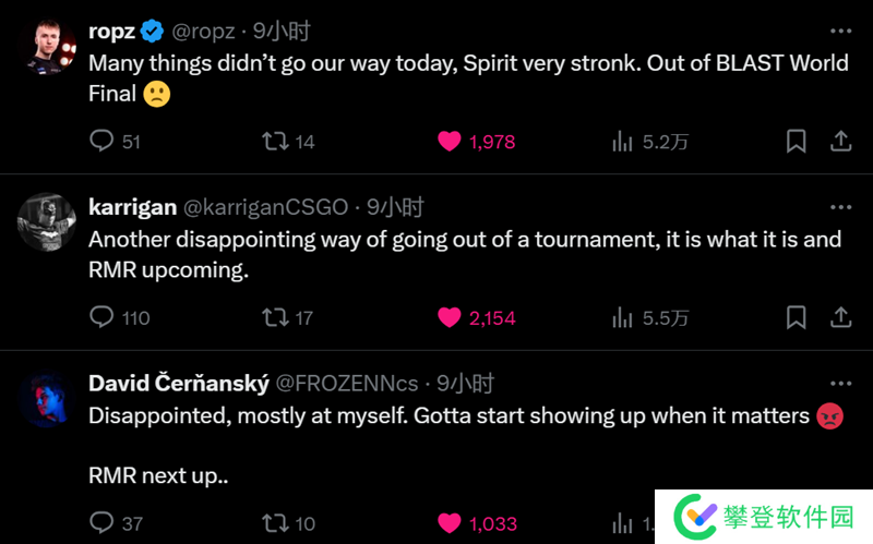 ropz:今天很多事情都没有如我们计划的那样走向。Spirit非常强大(stronk)。从BLAST 全球总决赛出局了。