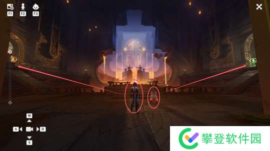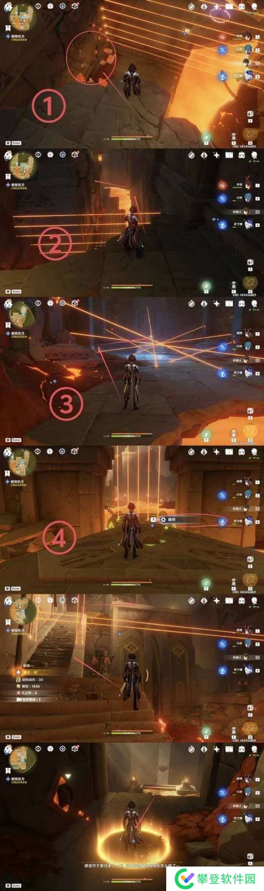 ④大门开启之后,前往操作摇杆,并上楼梯触碰激光使岩浆上升激活所有的火元素方碑,然后操作上方机关开门并使角色站在橙色光环下