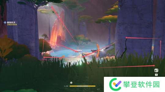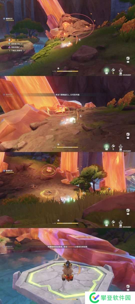 击碎碎石然后攻击五处「震颤晶石」,引发共振将岩晶柱坍塌前往下一处岩晶柱处同样的方式攻击五处「震颤晶石」,然后操作小峭锋龙站在平台上即可