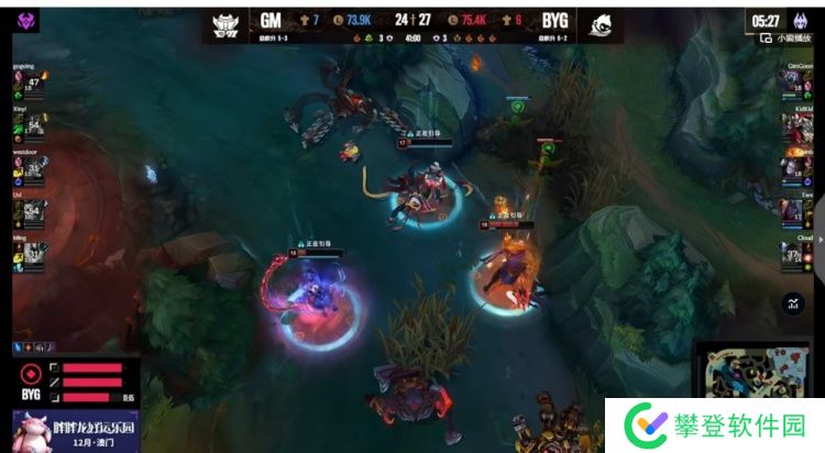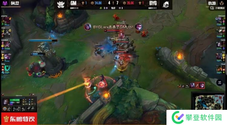 【24:20】中路团战少人的GM打野xinyi皇子先开盖了三个,但是Lwx维鲁斯在Cloud泰坦坩埚解围之后配合队友反杀掉了GM野辅!下路GimGoon贾克斯单推掉了下路高地塔!这波最终是BYG的1换2!