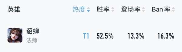 貂蝉一技能伤害遭到小幅下调,削弱后巅峰赛依旧拥有52.5%胜率+13.3%出场率,对抗路和中路玩法都非常强。