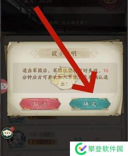 4、最后我们在弹出的页面点击确定即可退出军团,注意退出军团后技能自动失效,10分钟后放入再次加入军团。