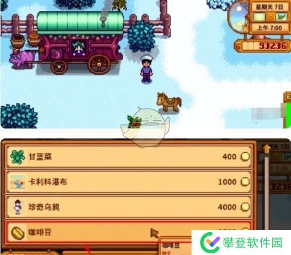 1、我们可以在猪车这里,和NPC互动后购买咖啡豆,猪车是随机刷新的;